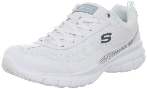Speed through your workday in sporty comfort with the SKECHERS Work: Tone-ups - Liberate SR shoe. Smooth leather and synthetic upper in a slip resistant sporty casual work sneaker with stitching and overlay detail. Resalyte flexible midsole. Smooth leather upper. Durable synthetic smooth faux leather overlays. Lace up sporty athletic styled slip resistant work sneaker design. Stitching accents. Leather and synthetic overlays. Microperforated side panels for cooling effect. Side S logo. Subtle printed side stripe design. Mesh fabric collar trim. Lace up front with metal top eyelet. Padded collar and tongue. Soft fabric shoe lining. Cushioned removable comfort insole. Shock absorbing Resalyte athletic style midsole. Midsole provides excellent support and stability. Super flexible midsole and outsole design for improved range of motion. Work friendly, OSHA compliant slip resistant traction rubber outsole. Electrical Hazard (EH) safe design. 1 1/4 inch built in heel.